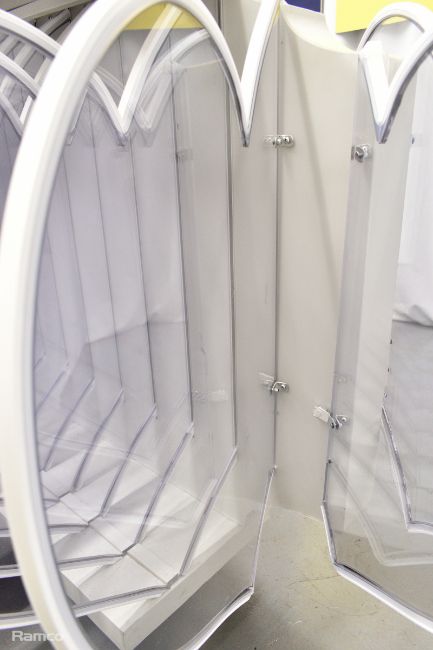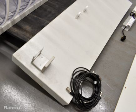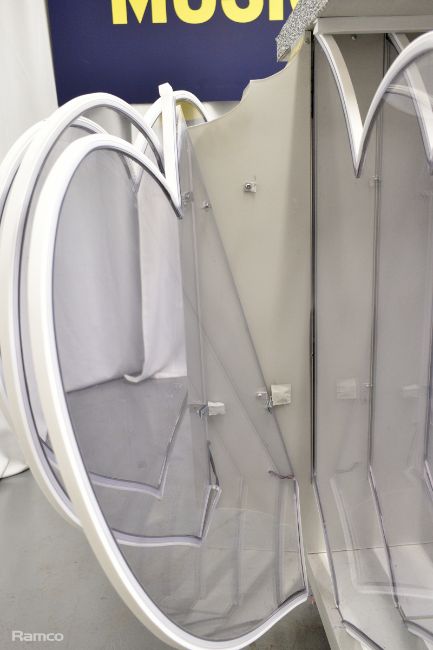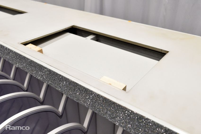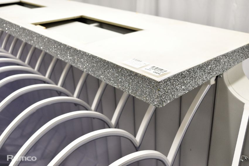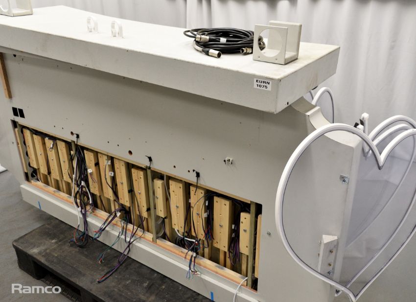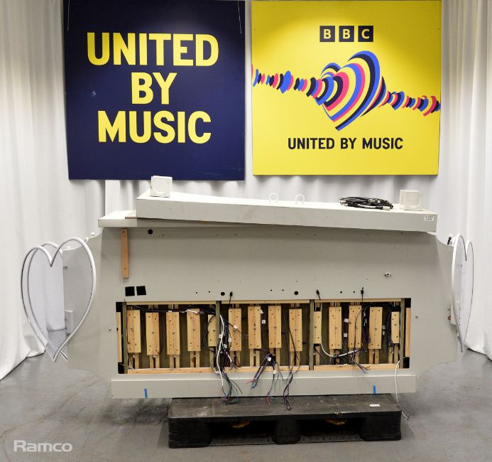 Presenters lectern used for the final results - white, metal, sparkly, clear perspex hearts with coloured lights - L 2700 x D 1100 x H 1000mm