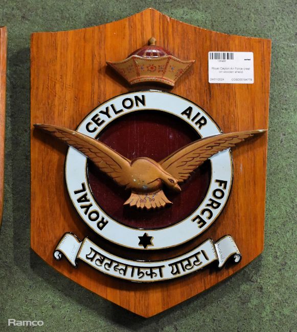 Royal Ceylon Air Force crest on wooden shield