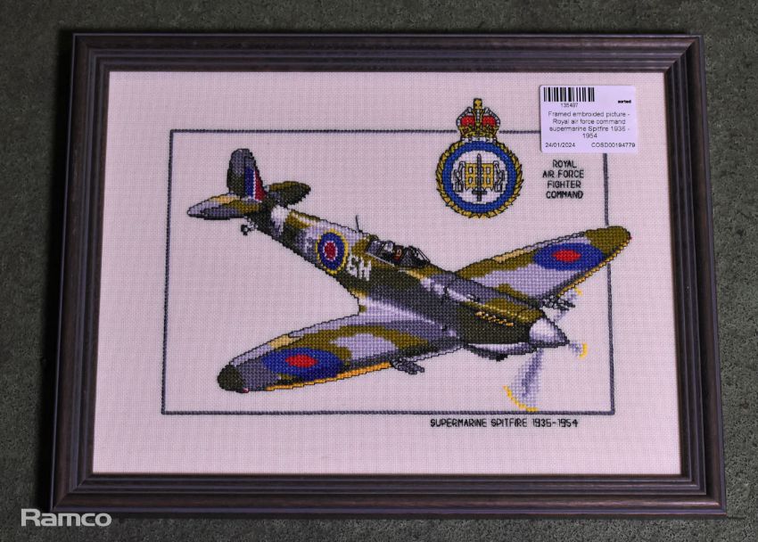 Framed embroidered picture - Royal air force command supermarine Spitfire 1936 - 1954