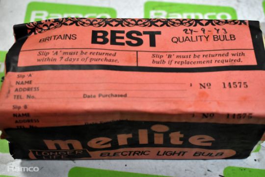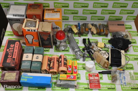 Vintage lighting equipment - bulbs, torches, switches - brands: Philips, Atlas, Merlite, Mazda, Osram, Bell, Lucas, Super Bosch