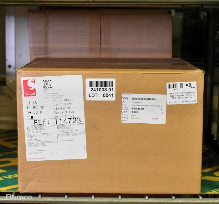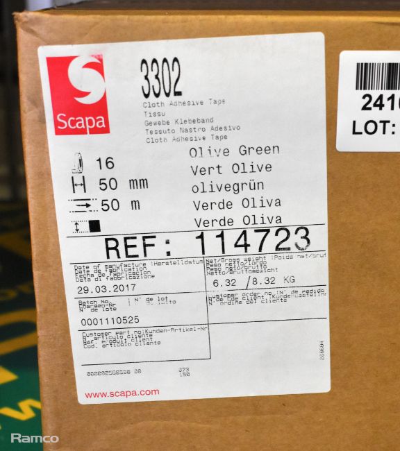 2x boxes of Scapa 3302 cloth adhesive tape olive green - 50mm x 50M - 16 rolls per box