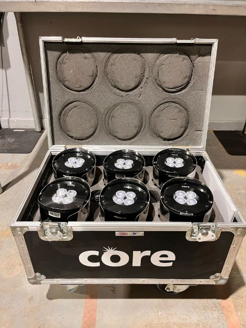 Set of 6x Core Colourpoint MKII LED IP uplighter in charging flightcase. Full working order. Serviced and PAT tested.