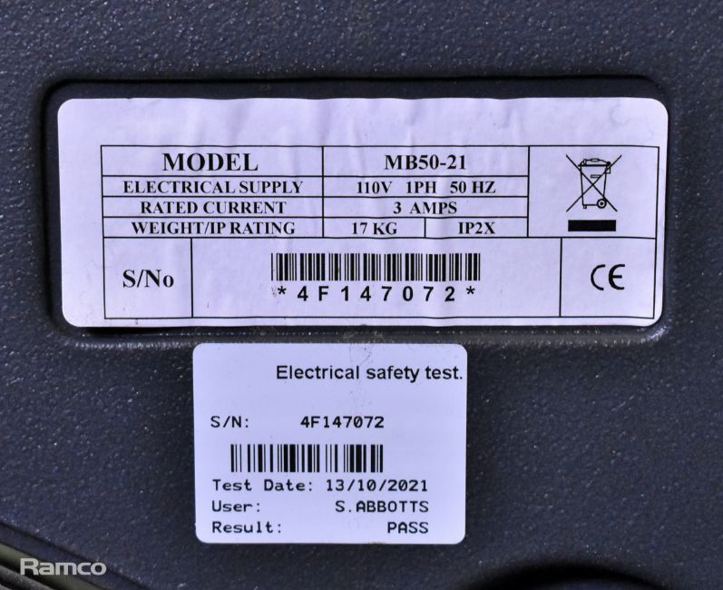 All equipment is untested by Ramco UK Ltd unless specifically stated in the lot itself and on that basis is sold as seen with no warranty implied or expressed.  No electrical items have been switched on or tested.  It is the buyer’s responsibility to have all items tested or serviced prior to use and this may include the requirement for repairs.