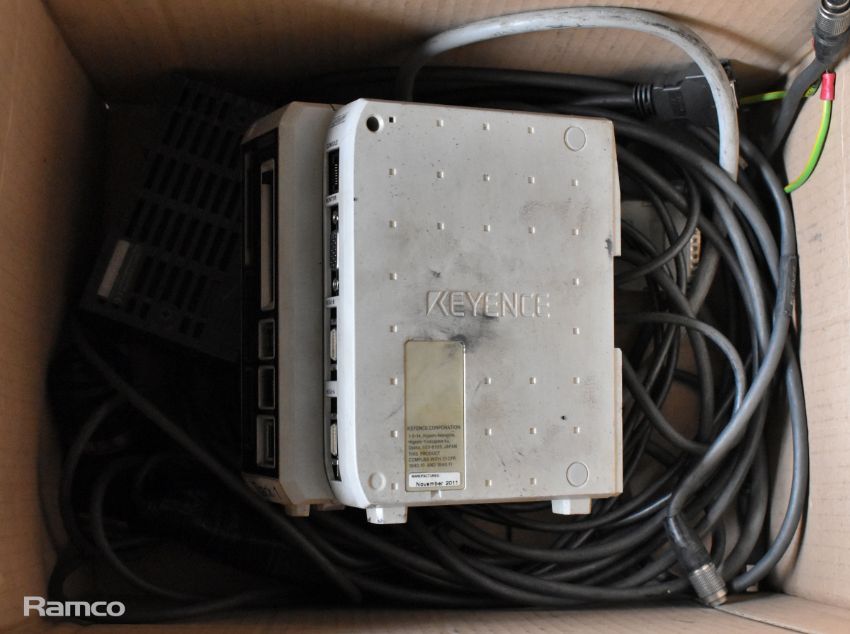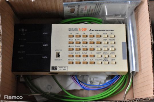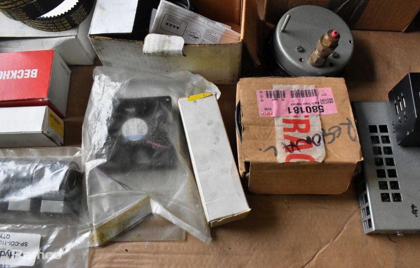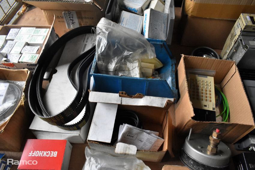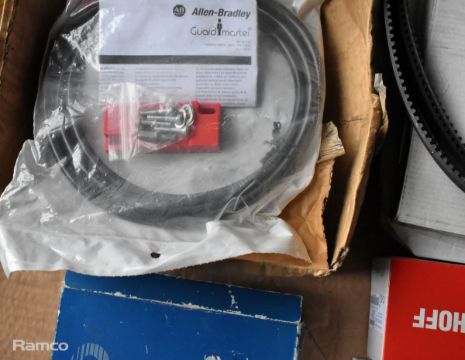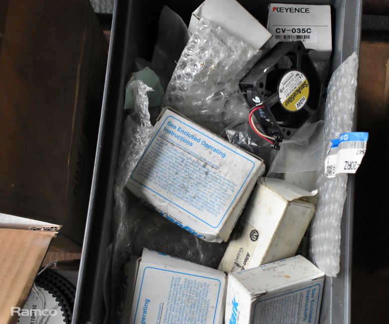 Mixed industrial/automation components - roller chain, fans, sensors, electric control panel, drive belt and more
