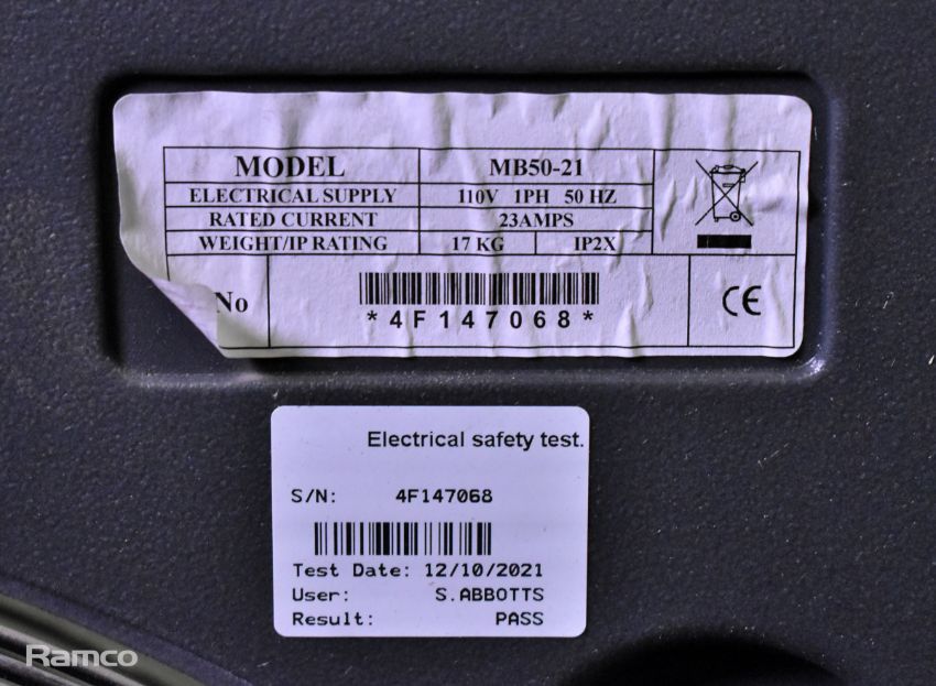 All equipment is untested by Ramco UK Ltd unless specifically stated in the lot itself and on that basis is sold as seen with no warranty implied or expressed.  No electrical items have been switched on or tested.  It is the buyer’s responsibility to have all items tested or serviced prior to use and this may include the requirement for repairs.