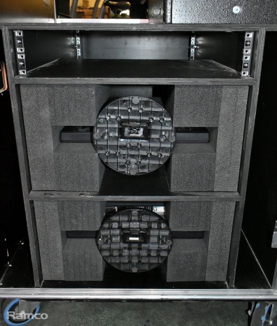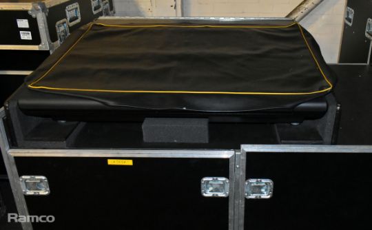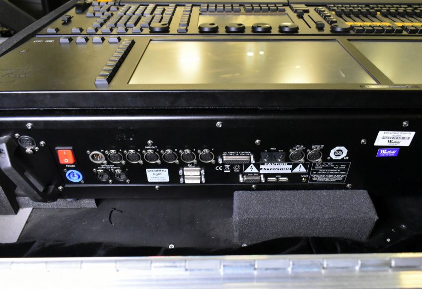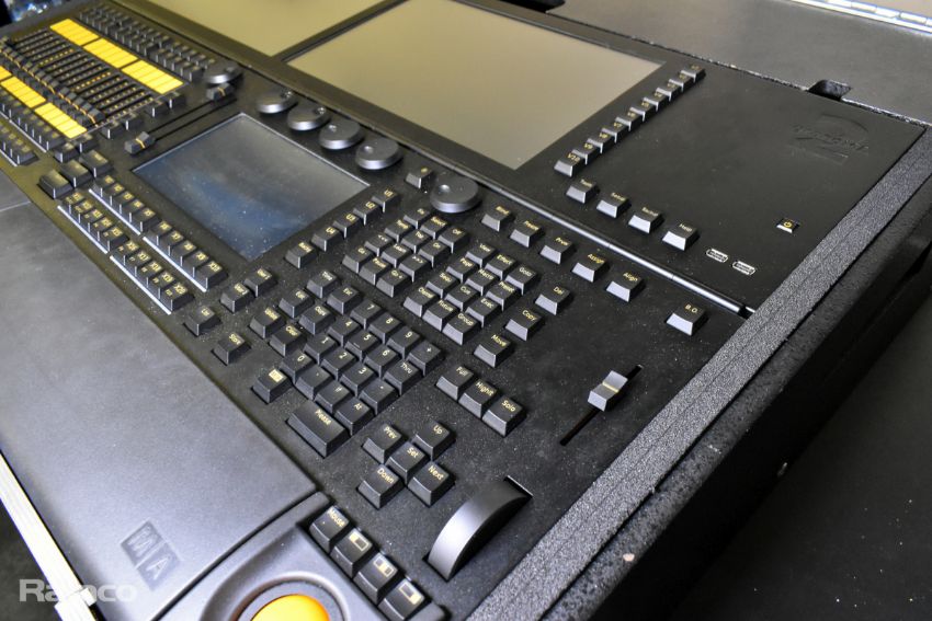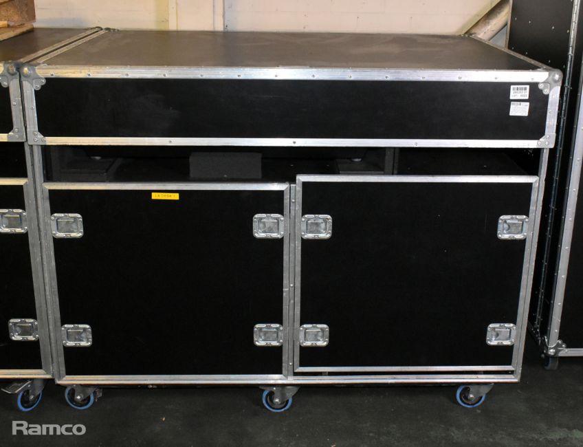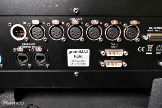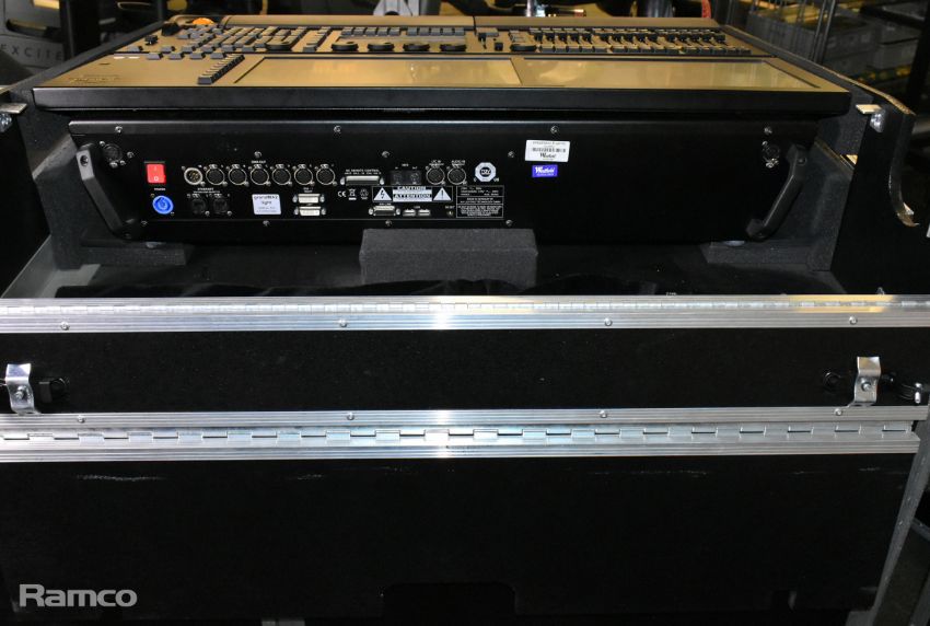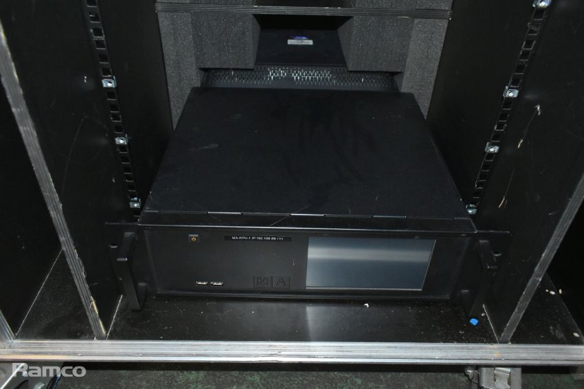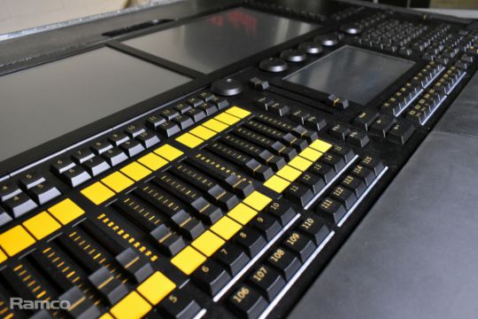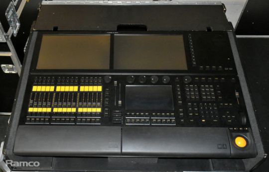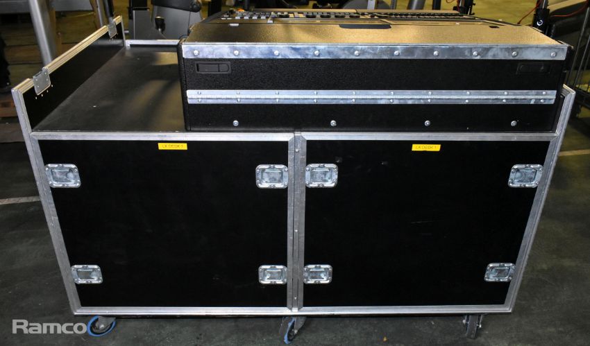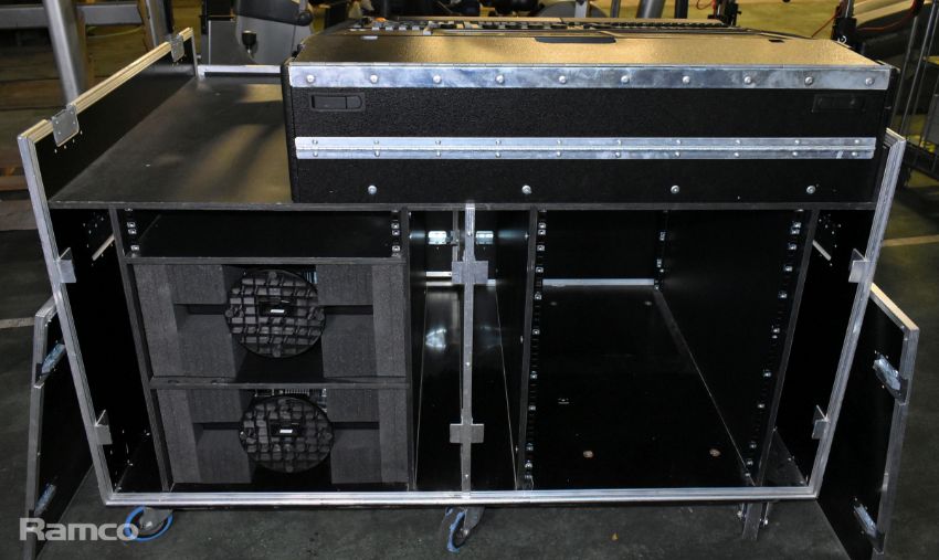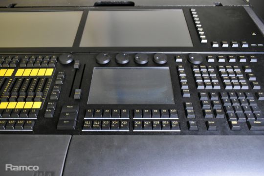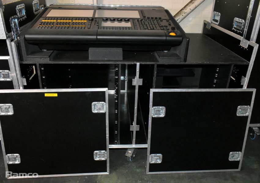 MA lighting GrandMA2 lighting console with 2x monitors and 1x MA lighting MA2 networking processing units in a mobile flight case - W 1480 x D 980 x H 1140mm